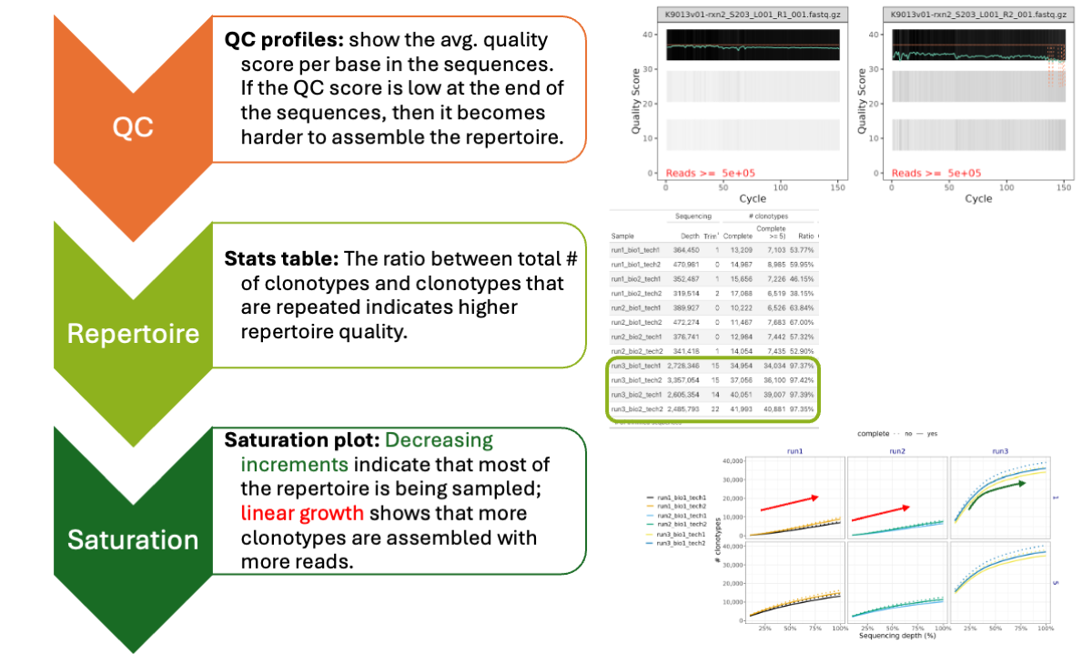• Saturation analysis:: Sequential bootstrapping of the sequencing data to assembly clonotypes with a fixed # of sequencing reads.