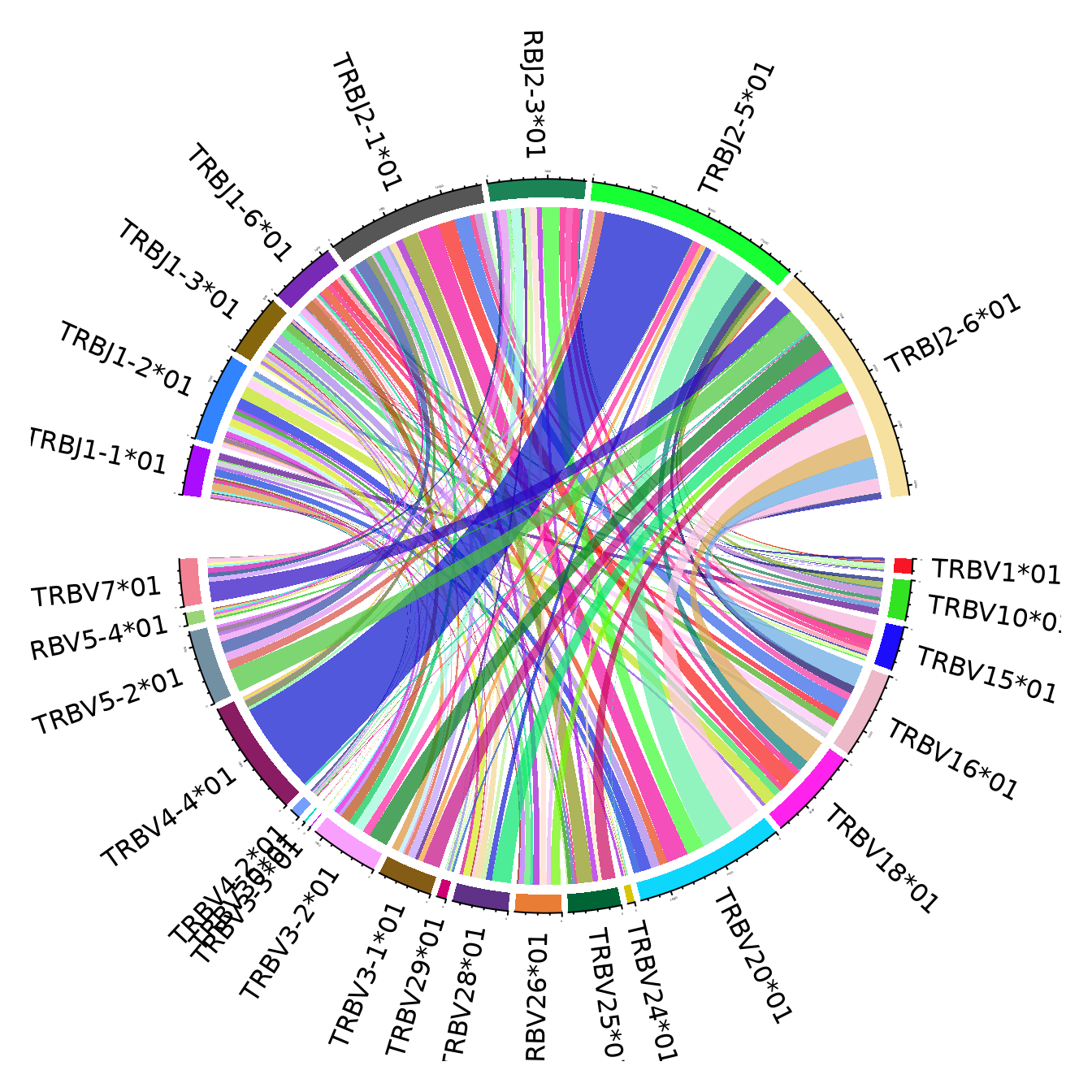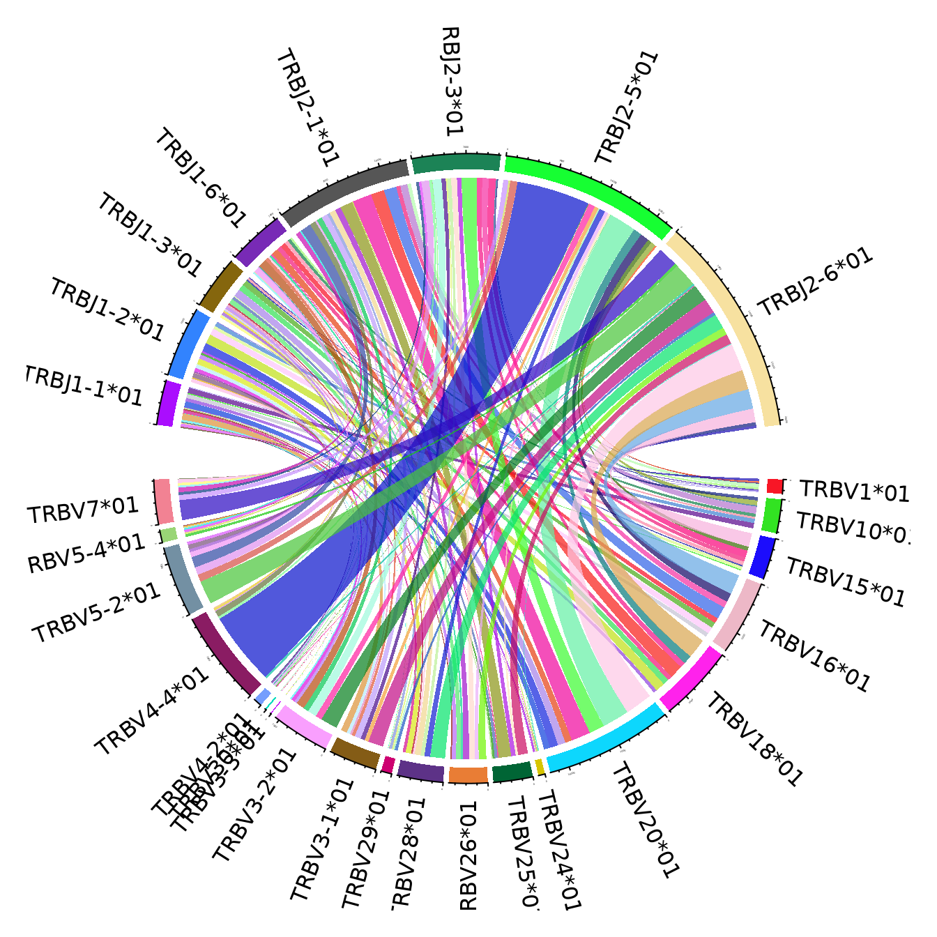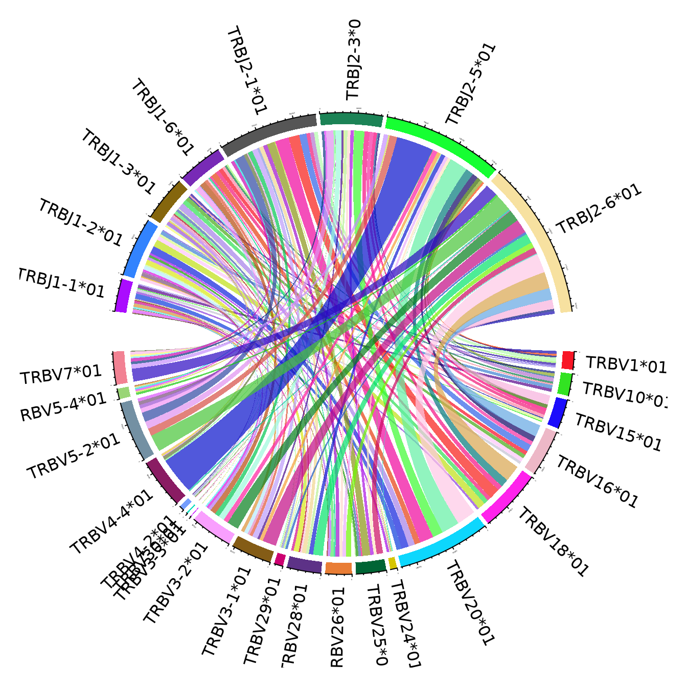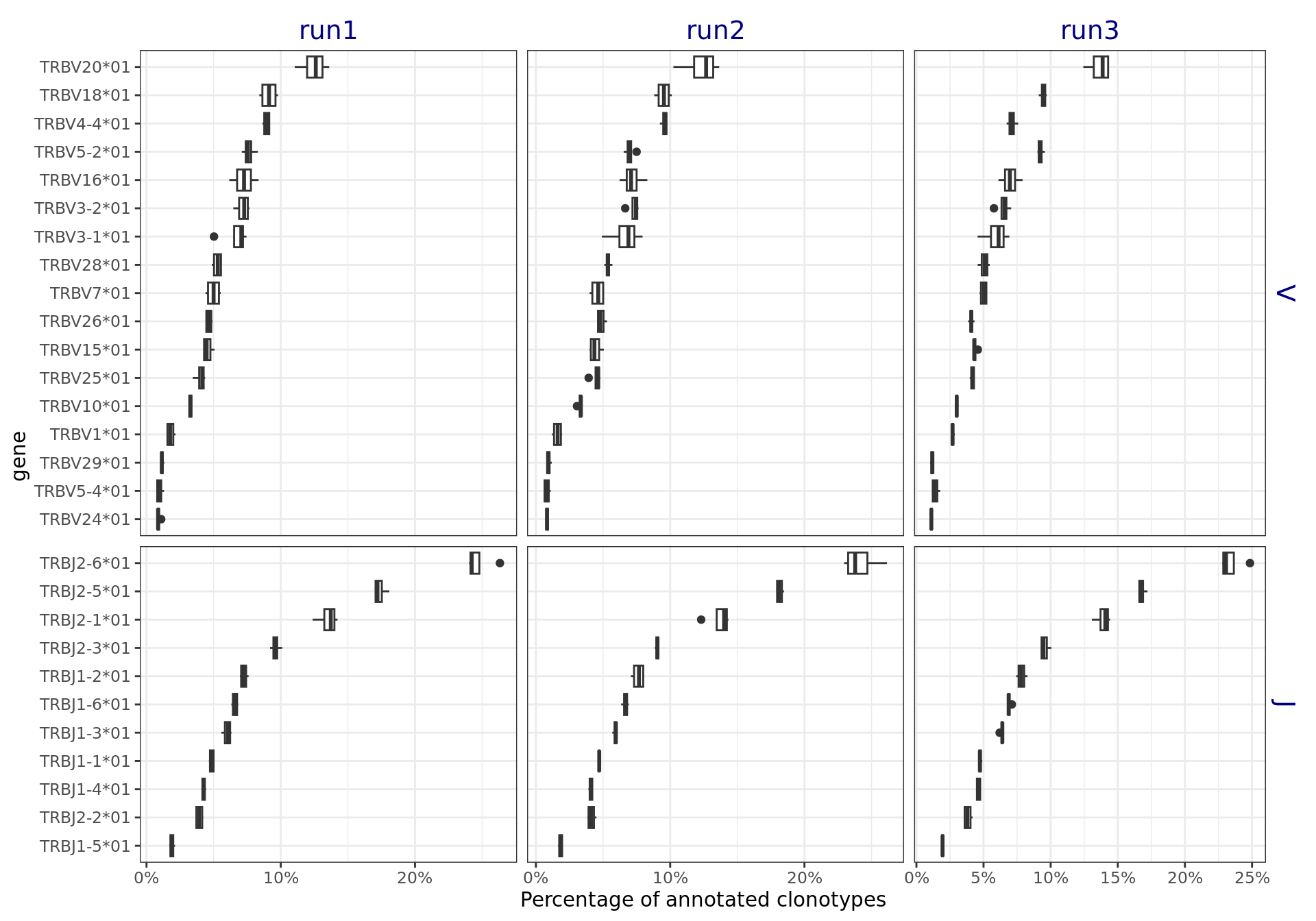 The figures use the clonotypes annotated by unique V and J genes, and ignoring the genes that portray less than 15% of the total number of annotated clonotypes