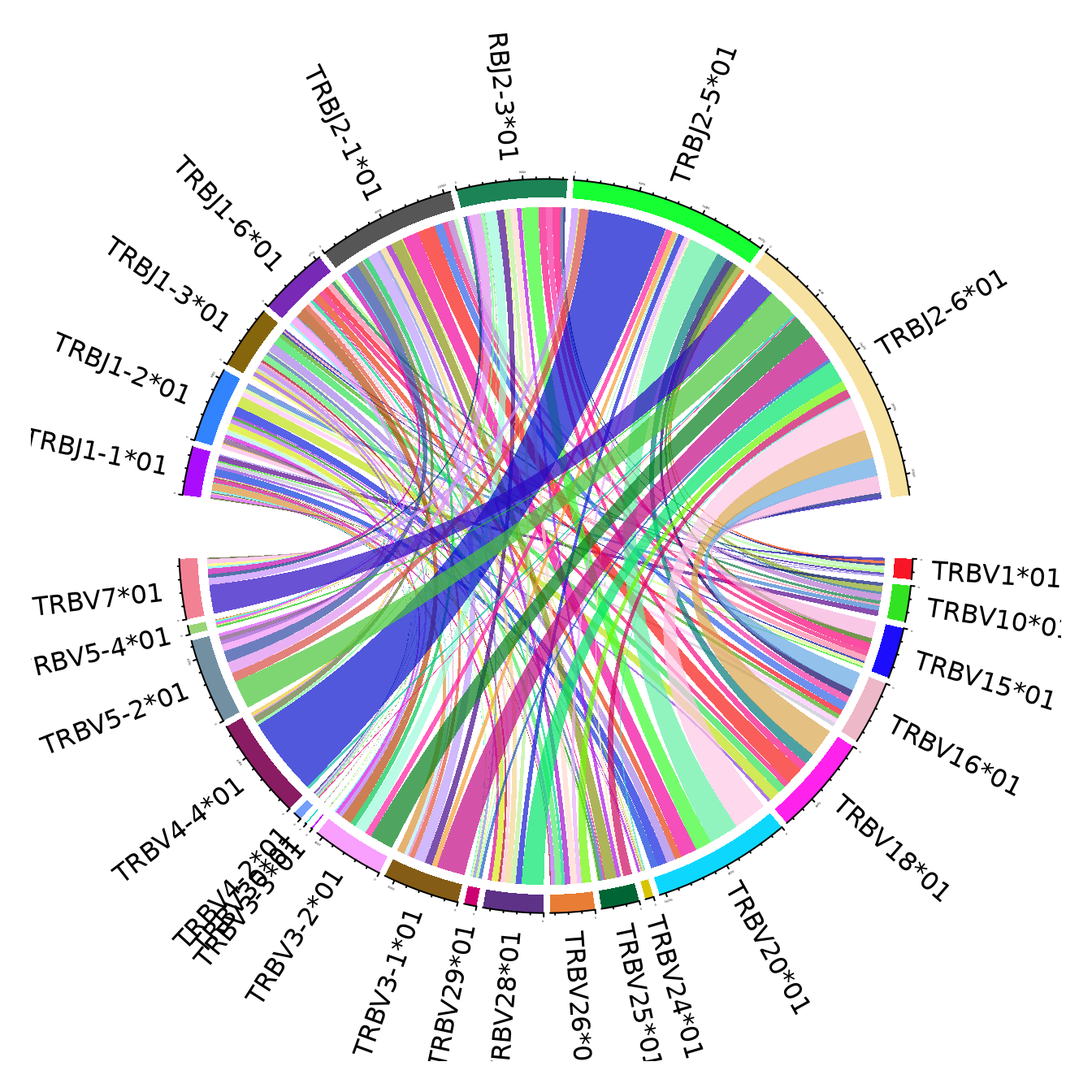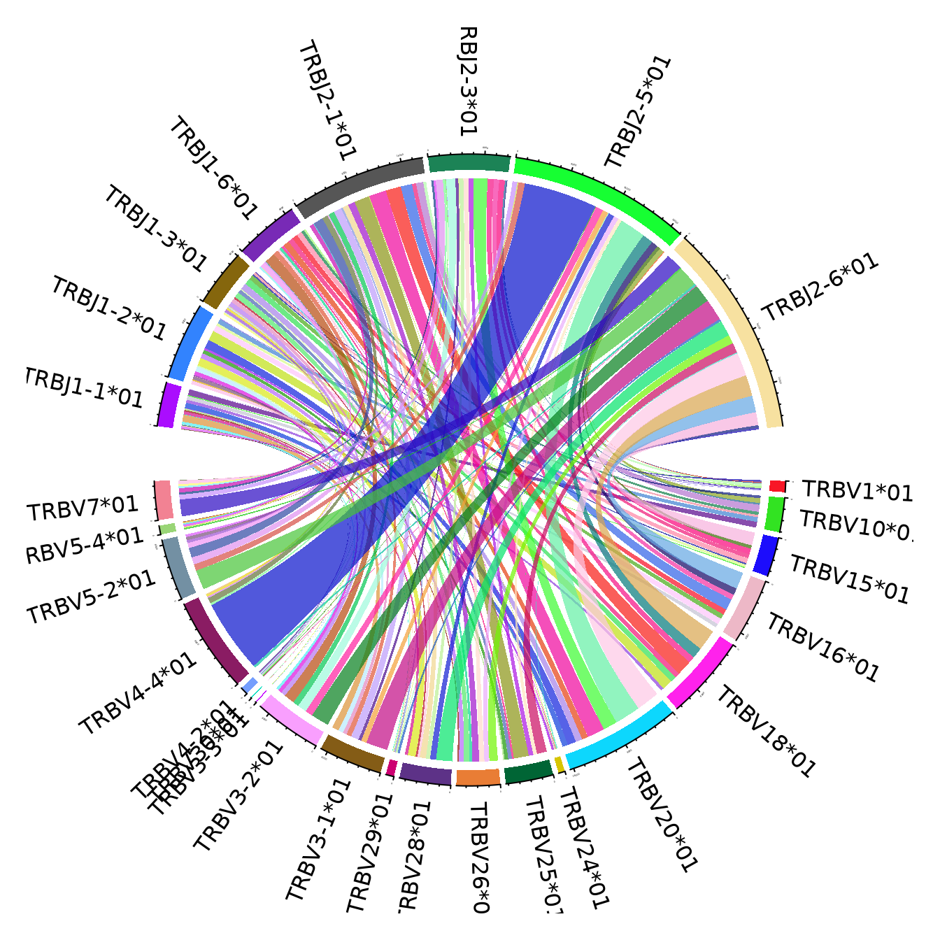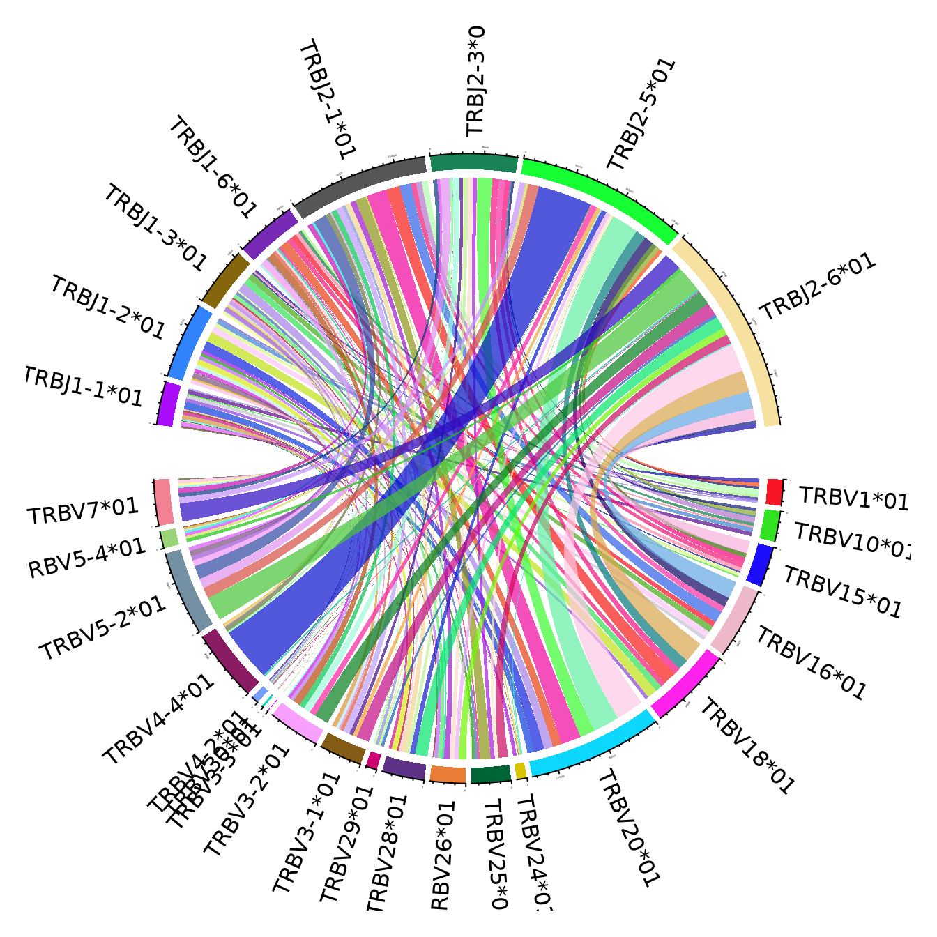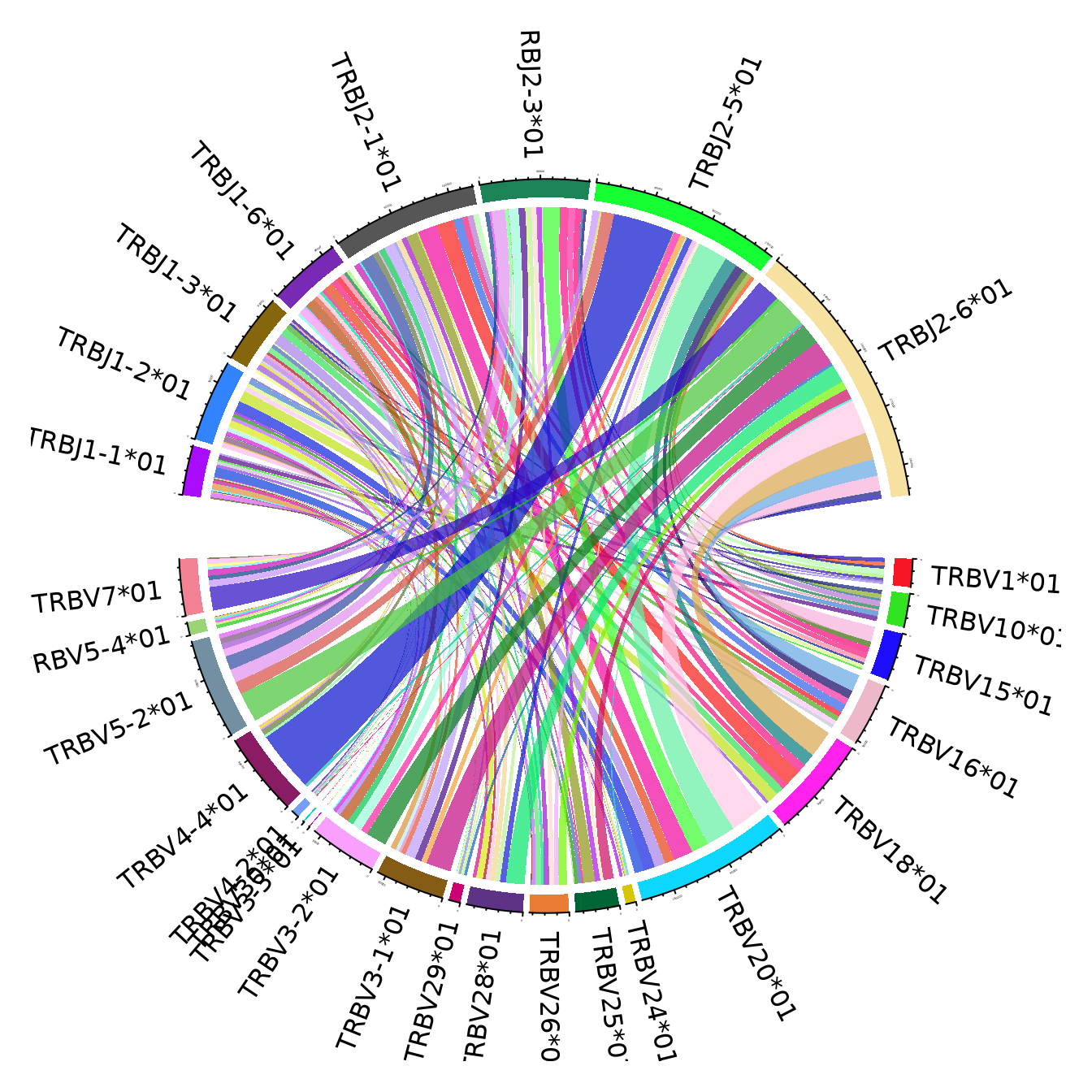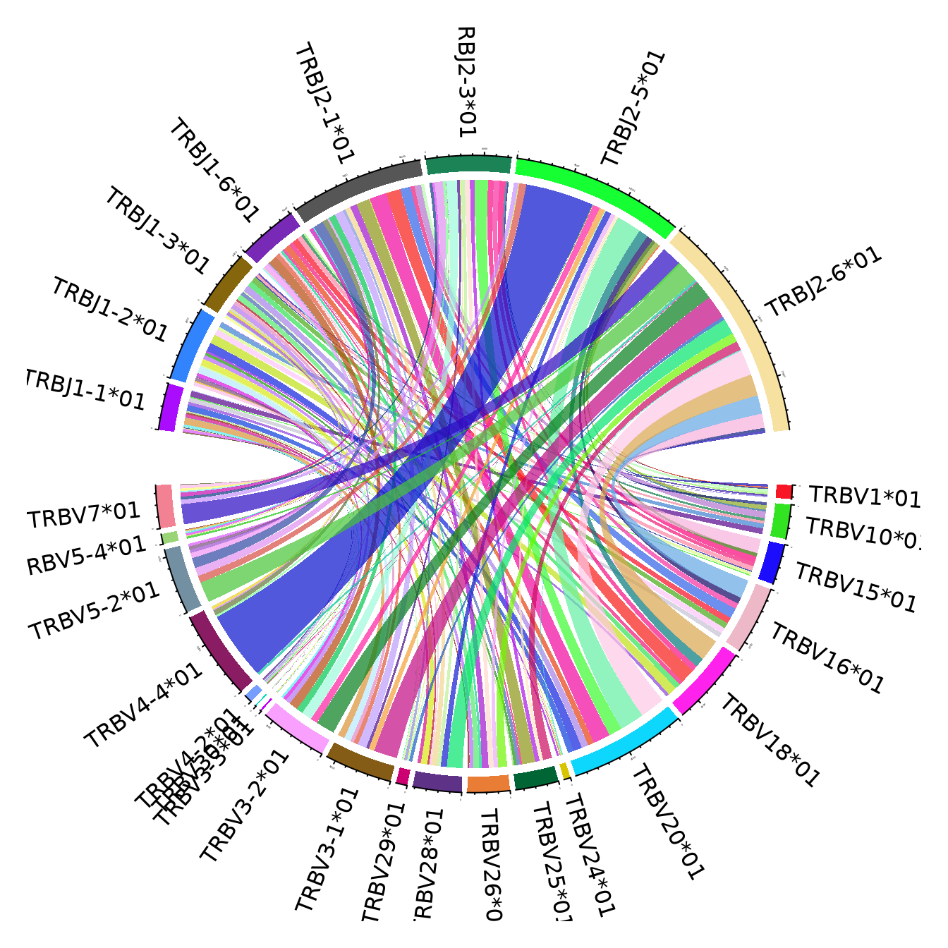 The figures use the clonotypes annotated by unique V and J genes, and ignoring the genes that portray less than 15% of the total number of annotated clonotypes