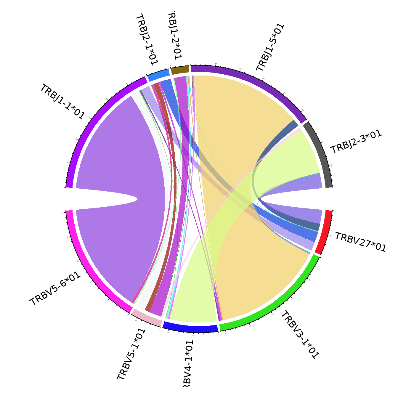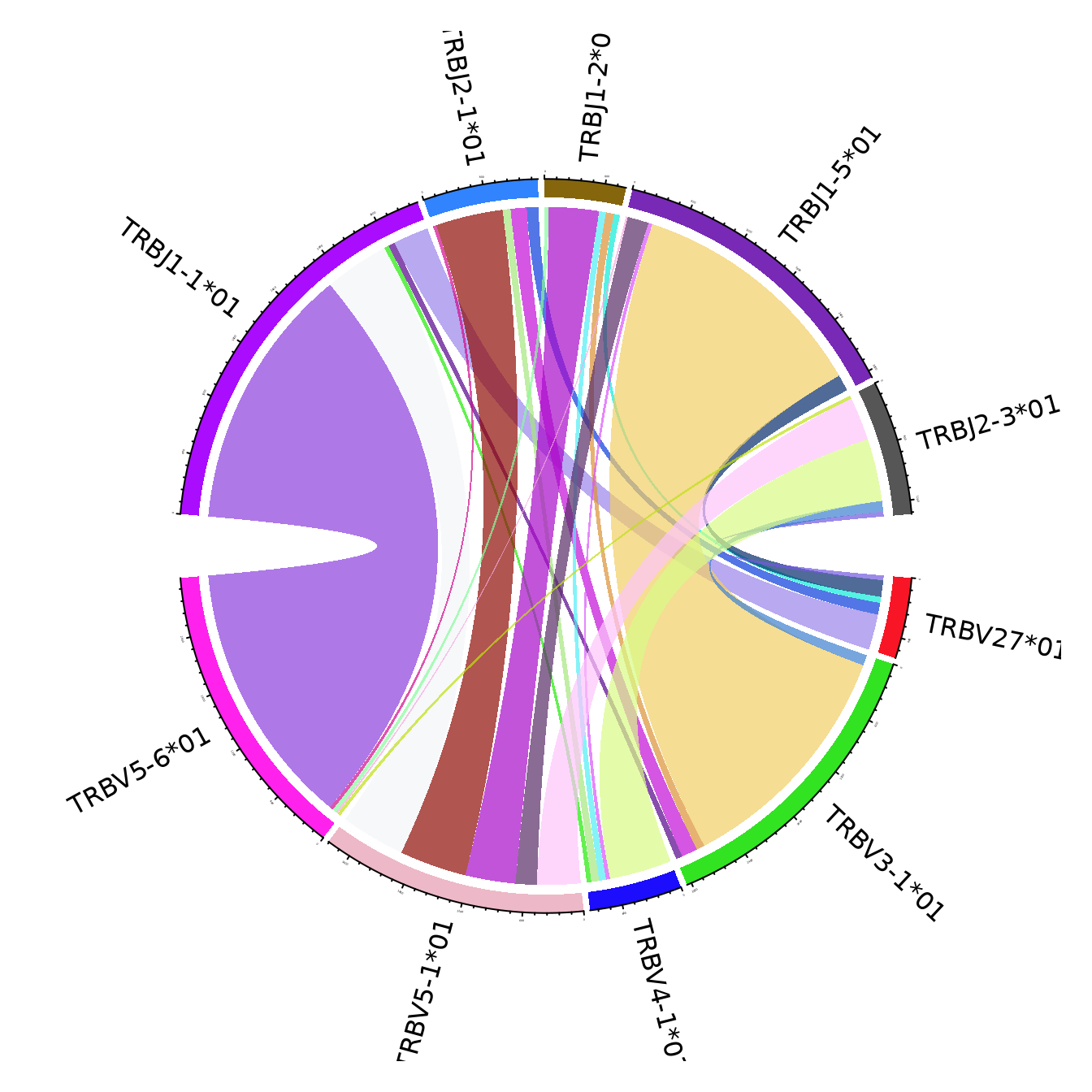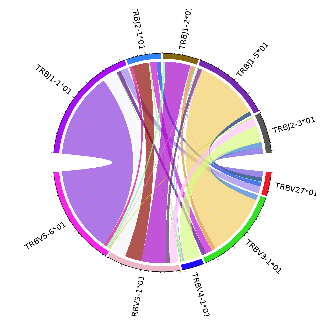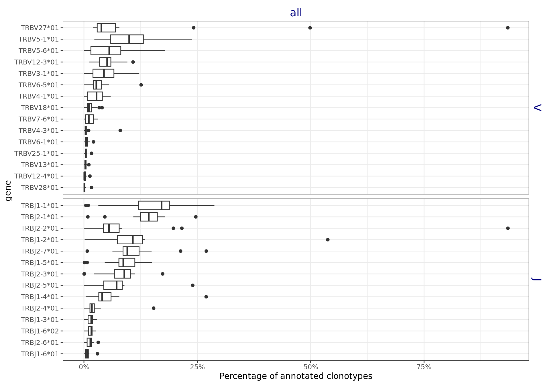 The figures use the clonotypes annotated by unique V and J genes, and ignoring the genes that portray less than 15% of the total number of annotated clonotypes