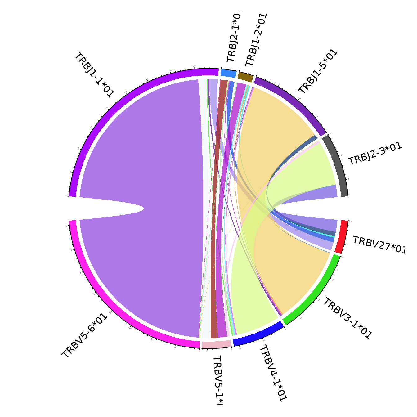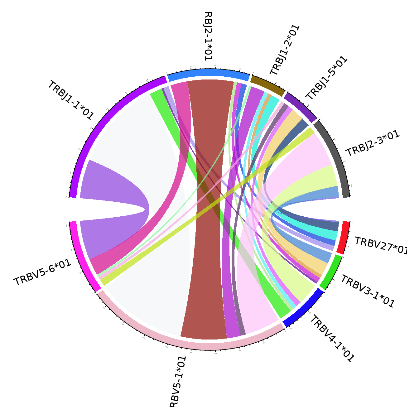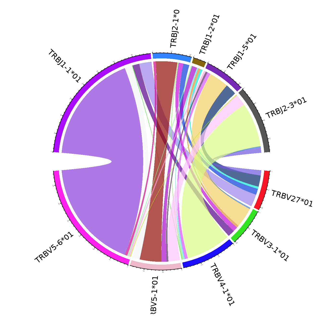 The figures use the clonotypes annotated by unique V and J genes, and ignoring the genes that portray less than 15% of the total number of annotated clonotypes