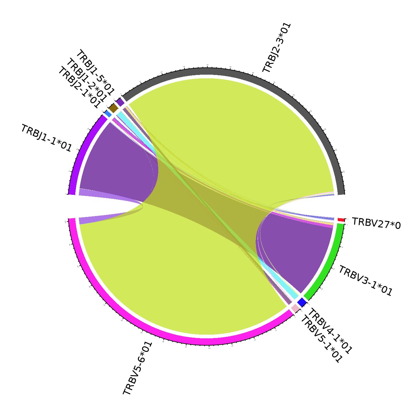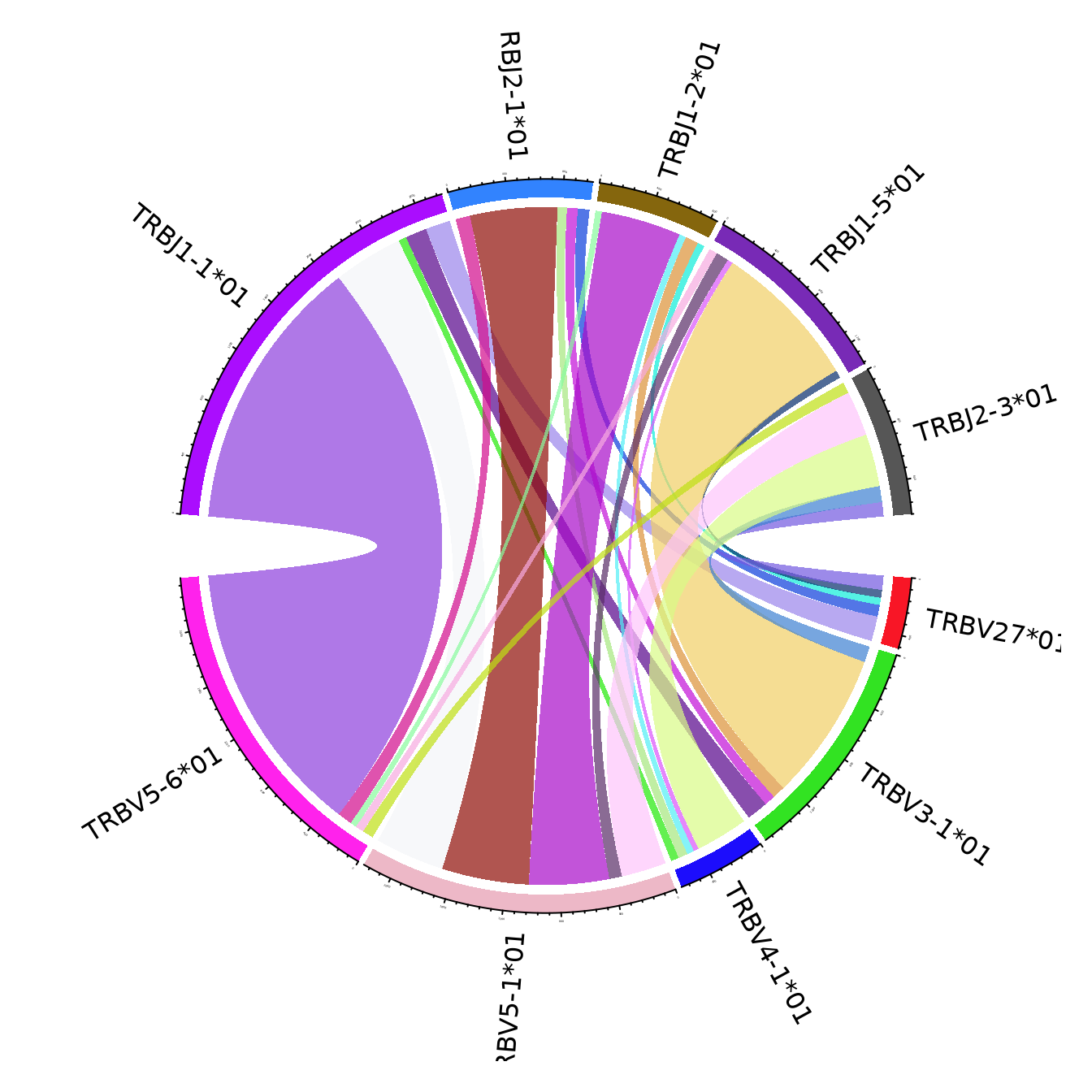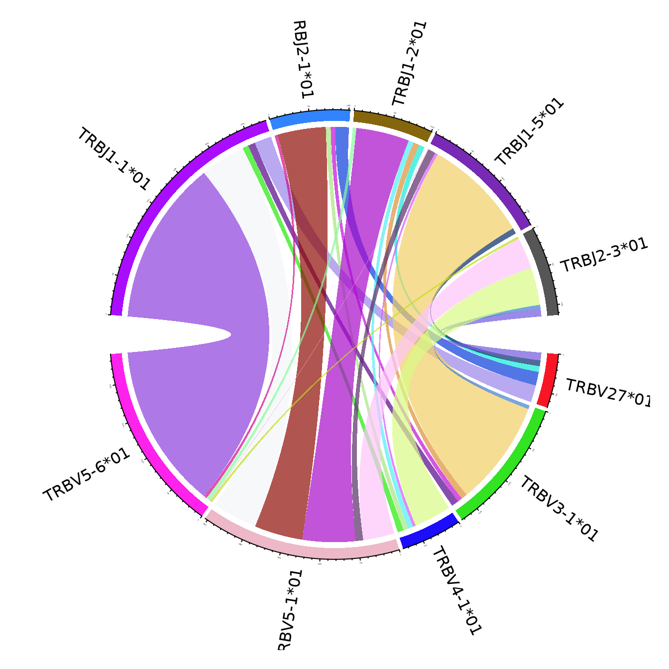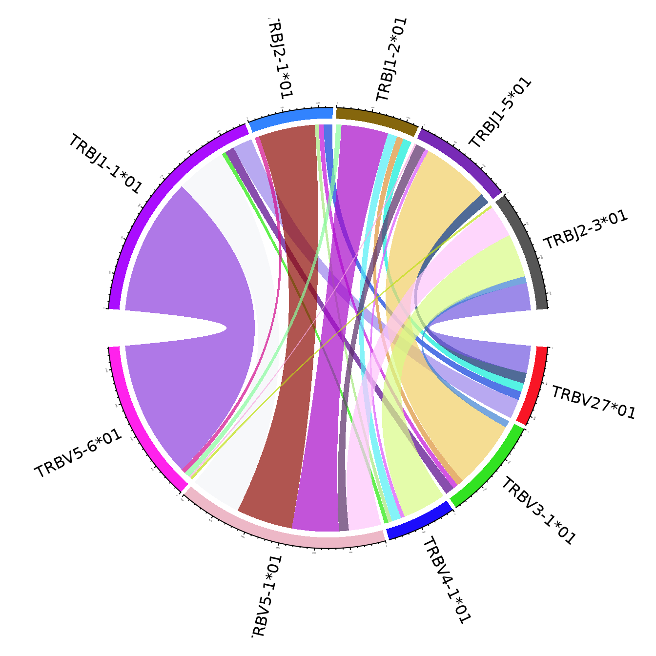 The figures use the clonotypes annotated by unique V and J genes, and ignoring the genes that portray less than 15% of the total number of annotated clonotypes