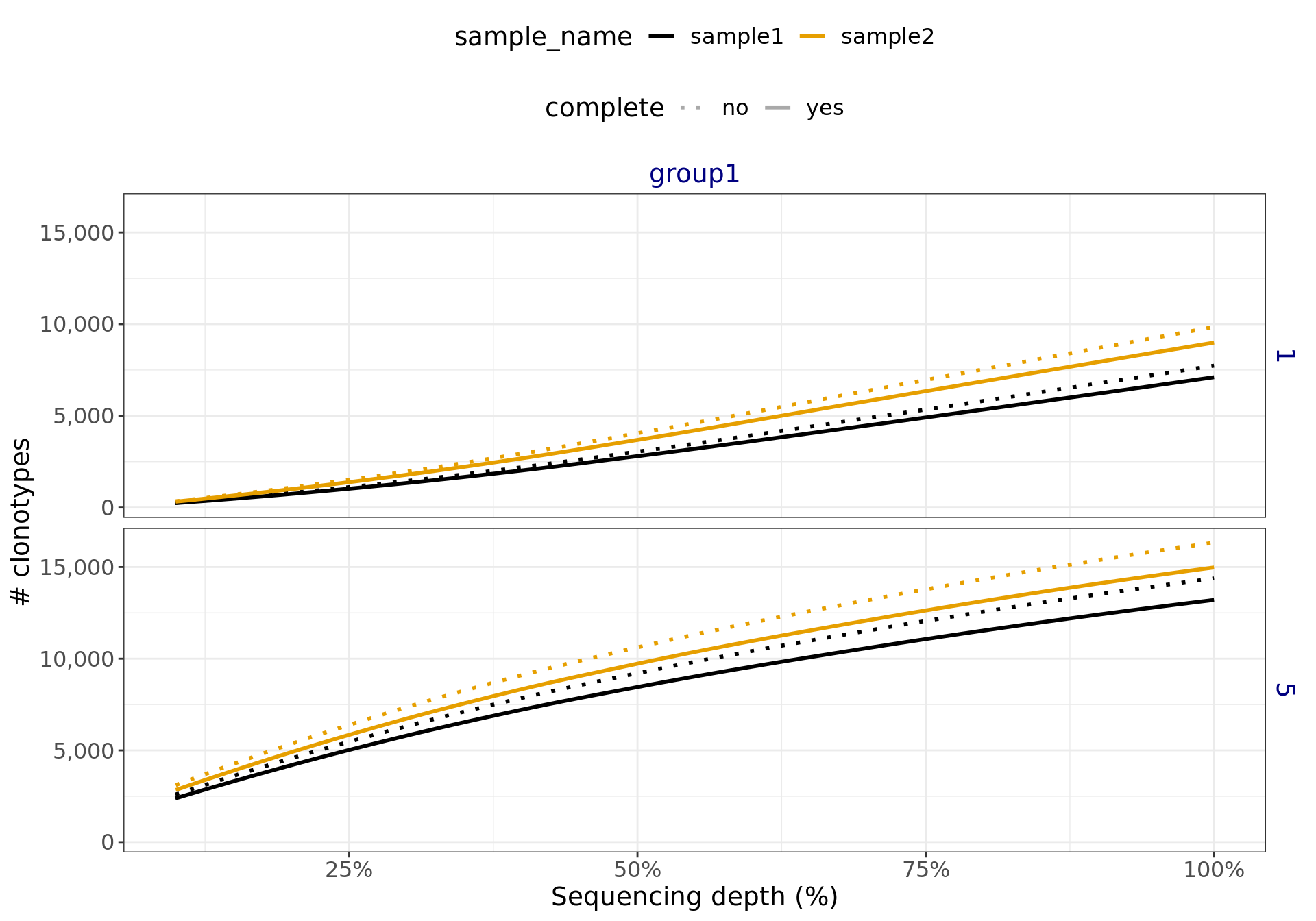 The complete report is available in here. For the saturation analysis, this will generate figures like Figure 2. The linear growth in the figure below indicates that a higher sequencing depth is required to adequately sample the TCR repertoire.